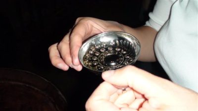 ワインのソムリエが、首から下げている灰皿のようなものを見て