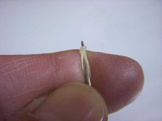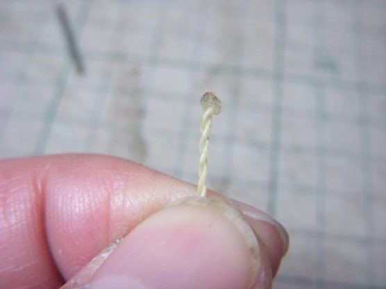前回のビニモ糸と同じように糸先をライターなどであぶって指先でつぶす。