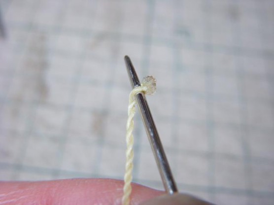 縫針に通したら、あぶった糸先を縫針の先端まで持って来て