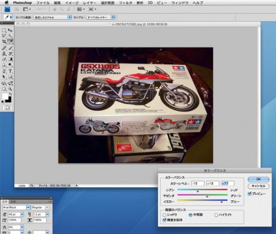 写真修正の方法は、様々なテクニックがあるけど、今回は仕事ではないので厳密な操作や完成度は無視して見た目だけの簡単補正ということでカラーバランスだけを使ってやってみる。