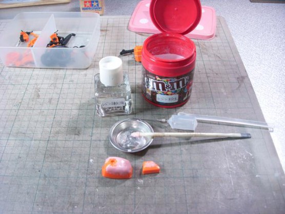 早速、手に入れたレジン粉末と硬化液を適当な容器に小分けして、Oさんから習った使い方を参考にして、現在メイキング中のプラモデルにパテとして使ってみる事にしました。