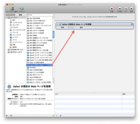 左側のメニューから「Safari の現在のWebページを取得」を右のエリアにドラッグ