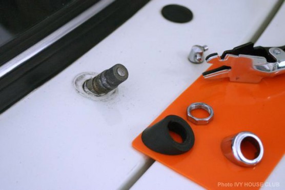 固定ナットを外すと、純正のゴム製ピボットはすぐに取り出せる。