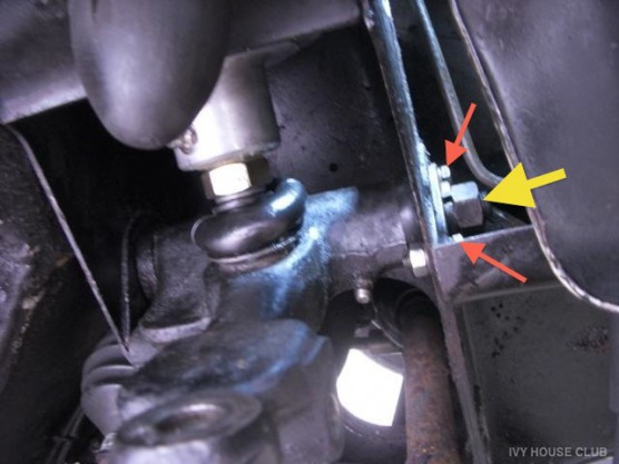 下の画像の赤い矢印のボルト(19mmスパナで対応)を外すことで