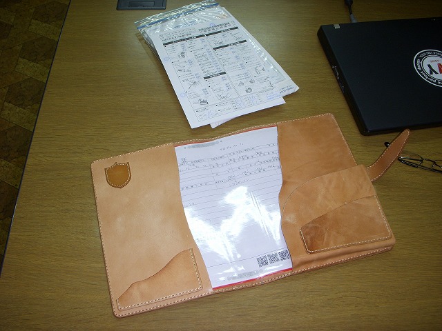 出来上がった車検証ケースは、表のバッジの取付けのバランスに少しだけミスが出たけど、どこにも無い一点物でとてもお気に入りなレザー車検証ケースになった♪