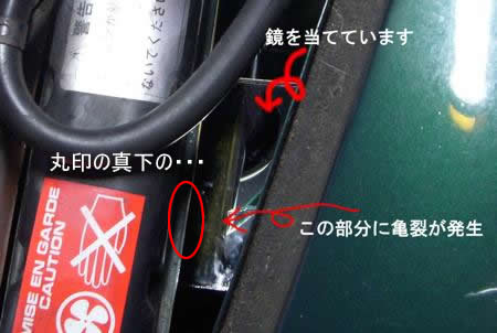 丸印の部分で真下の凸の頂上に約2センチ位の亀裂が走っていた。