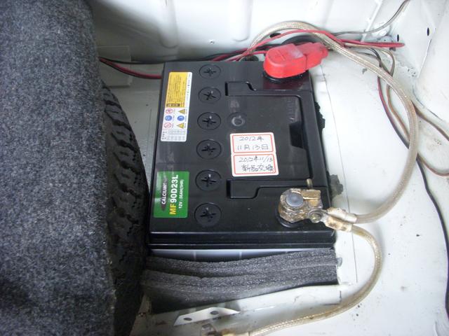 狭いトランクルームに在るバッテリーは、作業が中腰になる為に容量アップで重量の