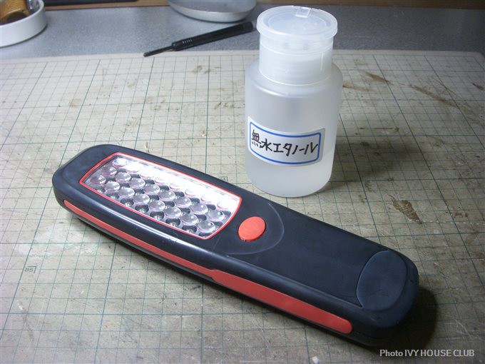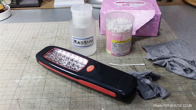 自分の場合は、幸いにも手元にあったプラモデル用のMrうすめ液や無水エタノールが使えることを発見したのですが、ネット等の情報では無水エタノールを使うことが一般的みたいです。