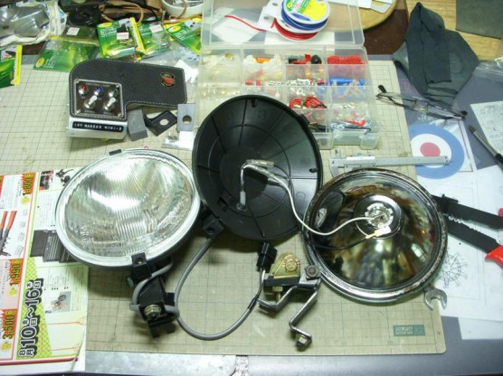 取付けの前に、とてもチープな配線をカプラー等を使用して引き直し、更に取付けの台座も気に入らなかったので純正のフォグランプから移植した。台座を取り外してしまった純正フォグランプは今後も使いたいので、次の英国発注会で台座のみを手に入れて元に戻しておきたい。