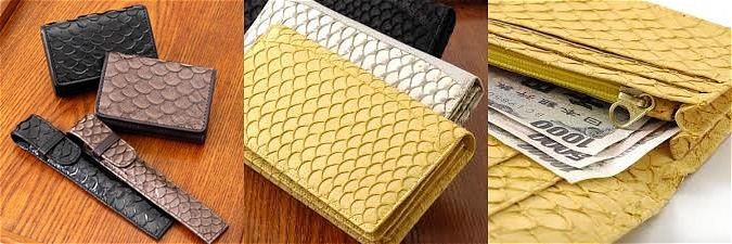 整然と並ぶウロコが美しい鯉の革は、ウォレット(財布)などに装飾され、金運向上の縁起担ぎに採用されて重宝されることもある。
