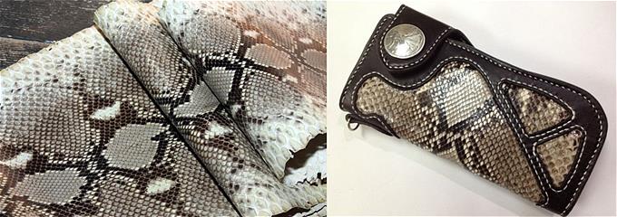 画像はキングパイソンの革で、主に装飾やワンポイントのアクセントなどに使用されます。
