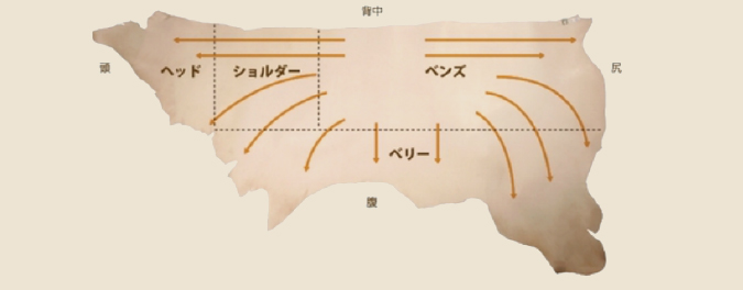 動物の革には、各部位毎に名称があり、その繊維方向も一定ではなく様々な方向に向いているという特徴があります。