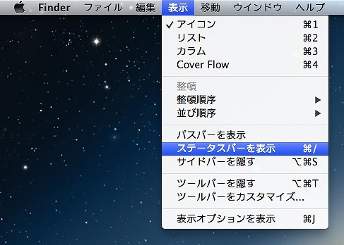 メニューバーの「表示」から「ステータスバーを表示」を選択する。