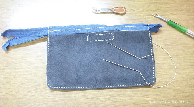 縫い終わりの糸の処理は、普通なら革の間から出して隠すように処理するのですが、今回は裏側になって目立たないということでそのまま簡単に処理します。