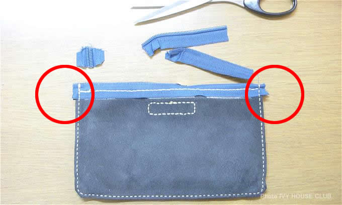 新しく取り付けたファスナーの要らない部分をはさみでカットして