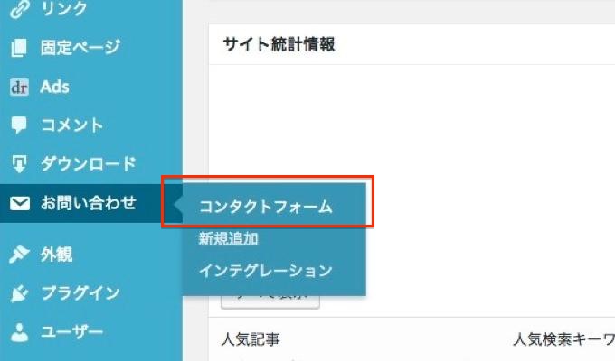 まずは、いつものようにダッシュボード上、左側のメニューにある「お問い合わせ」から「コンタクトフォーム」の編集ページを開きます。