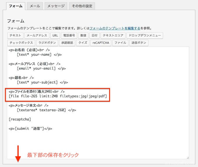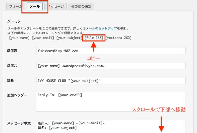 メールタブの下側までスクロールして、ファイル添付の入力欄にコピーしたタグをペースト(貼り付け)して保存します。
