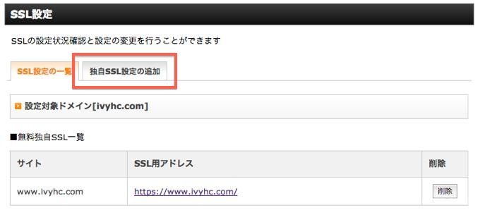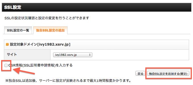 「独自SSL設定の追加」タブを開き、自分のサイトを確認して「独自SSL設定を追加する(確定)」をクリックして完了です。
