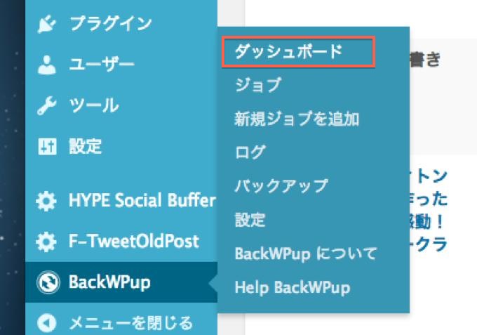 その後、メニューから「BackWPup→ダッシュボード」を選択します。