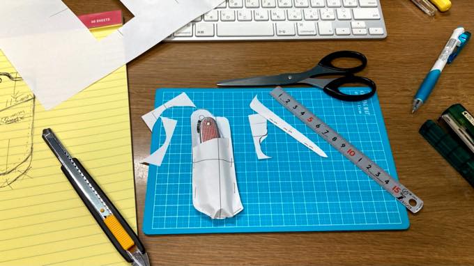 スケッチデザインをもとにPCで製図してプリントアウト。