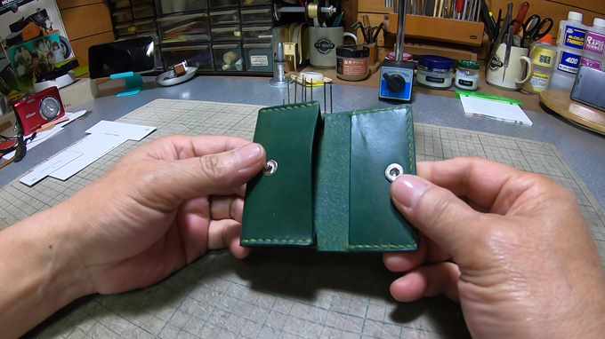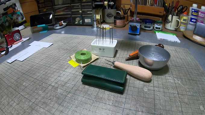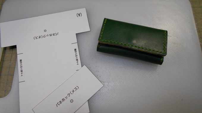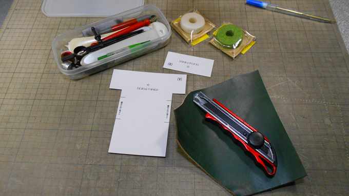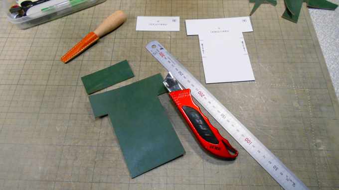 型紙を革素材にあてがって丸ギリなどでケガいて