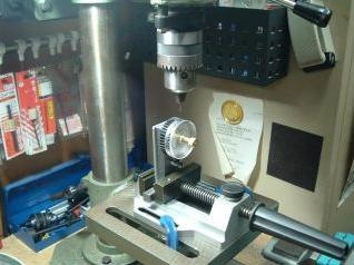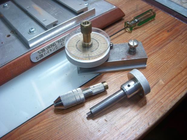 前に作った簡易割出盤にアダプターとして改造した、ピンバイスを取り付けて、レールにセット。