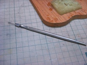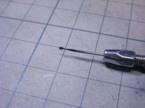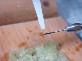 針の先端を平らに潰して、瞬着液が先端に溜まるように加工試行錯誤して試したところ