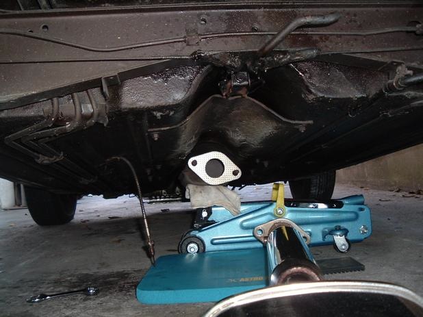 フロアージャッキを利用して、重たいマフラーを支えておく。