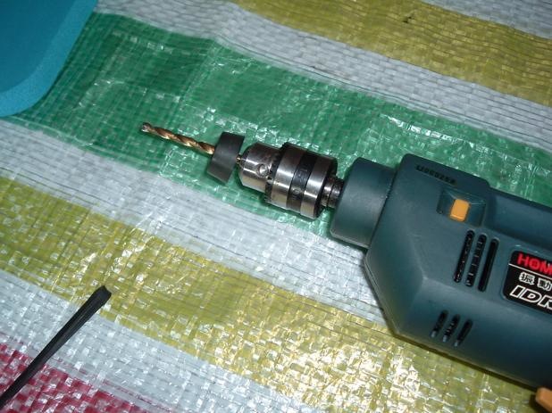 鉄板に穴をあける場合は、最後に必ずドンと突き抜けて傷がつくので、その辺に転がっていたゴムをドリルに取付けて衝撃吸収の緩衝材に利用する