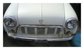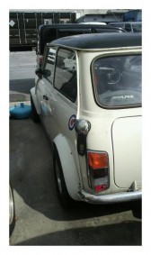 ある日、車検を受けるための整備の相談に、ミニを扱う修理工場(エム商会)に立ち寄ったところ、部品取りのための廃棄車両の中に混ざって放置されているヒゲモールとワークスグリルがひときわ目立ったミニに目が止まった。