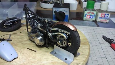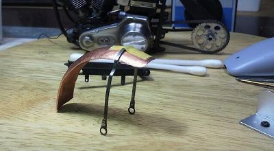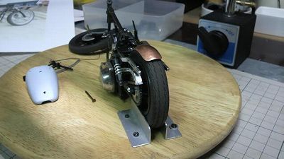 ステーは、こんな感じかな♪ステー本体は1ミリ真鍮丸棒の叩き出しで作りました 取付け基部は、0.3ミリ真鍮板から削りだしです。 フェンダー自体の仕上げはこれから! 後は、フェンダーとの取付けをどんな風にするか カスタムハーレーの写真集を参考に考え中! (最終更新2010/11/24/Wed/13:41:00)