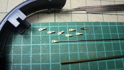 キットのステーは、めっき処理された細いモールド線を両端に貼り付けるだけの表現だったので、作り直すことにした。まずはジョイント部分の部品の作成 内径0.6mm外径1mmのシンチュウ管の端を潰して虫ピンボルトを通すため0.5ミリの穴を開口してそれらしく整形する。 キットでは、フェンダーの片面に一本、端と端にドブ付けの両面で計2本だけの省略表現だけど、写真を見るとそれぞれフォークにも固定された計4本で構成されているので、ステーは4本、ジョイント部分が計8個必要である。 (最終更新2010/11/24/Wed/17:54:10)