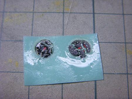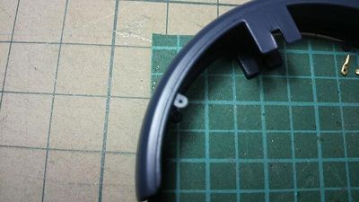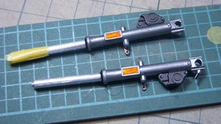 フェンダー側のステージョイントは、0.3ミリ厚のシンチュウ版から2ミリ幅の部材を帯状に切り出して それぞれ穴あけ加工後に形状を削りだした。 フェンダーは既に第一回目の塗装済みだったけど、ステージョイント金具の取り付けのため形状に合わせて掘り込み、瞬着を硬化剤を使って盛り付けるように埋め込んで接着した。 あまり力のかからないところなので、なにもそこまでガチガチに固めなくても良いよね(笑) 最後にタッチアップ塗装で工作完了! 後は、いつもの通常の塗装でフェンダーを仕上げる (最終更新2010/11/24/Wed/18:10:54)