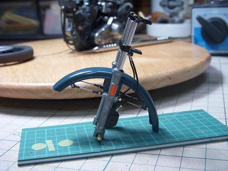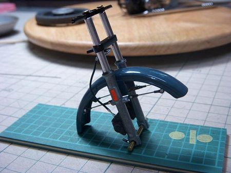 フロントフォーク側にあるフェンダーステー取付用のジョイントのクローズアップです。同じく0.3mm厚のシンチュウ板から1.5mm幅の帯状に切出して加工しました。 黒染め液で強制的に腐食させて染めてあるので、アップでは汚く見えているけど遠目にはとてもいい感じ! フォークインナーは、3mmアルミ棒に置換え、 インナーヘッド部分をトップブリッジに差し込めるように段差加工して中心にボルト用の穴を開口してあります。 後でピカピカに磨いて仕上げたいですね。 そうそう、反射板はどうしたらうまく表現できるのか只今、無い頭で必死に考えているところです(汗) (最終更新2010/11/25/Thu/12:55:46)