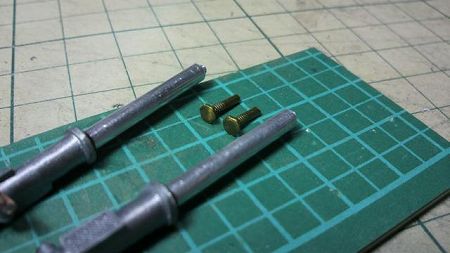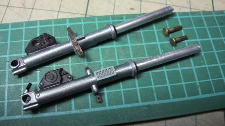 フロントフォークをトップブリッジに固定するボルトのアップです。なるべく実車と同じような取り付け方法を再現しようと思い、シンチュウ釘の頭を6角形に削りだして表現してみました。 後で、クロムシルバーに塗装しようかとも考えたけど・・・ 実車にもゴールドアルマイトの装飾ボルトがあるはずだと思い、そのままシンチュウの素材色を活かしてあえてそのまま使う予定です。 ネジの様に見えている段差が、しっかりと固定してくれますので接着剤要らず。 抜き差しが可能なので、後で分解も可能です。 (最終更新2010/11/25/Thu/13:20:24)
