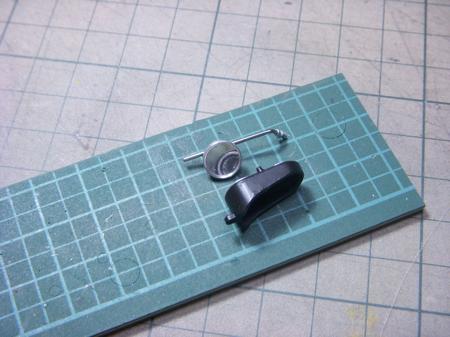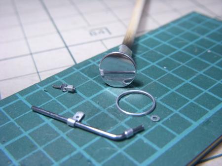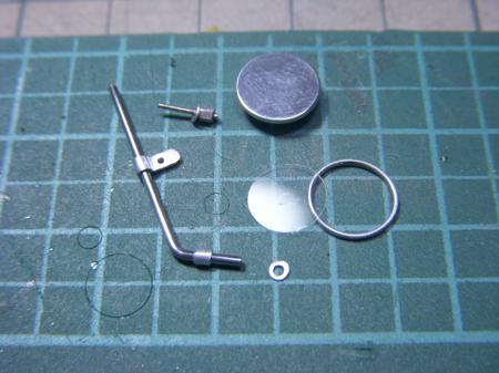 切り出して、加工を終えたミラーの部品8mmアルミ棒を皿状に削り出し、8mmアルミパイプを薄く輪切りにしてリングを作る。 1mmπのピアノ線でロッド、アルミ板から取付けジョイント板、虫ピンと1.4mmアルミパイプでボルト&ワッシャーを作った。 表面のガラスの質感を出す為にアセテートフィルムも準備した。 (最終更新2010/12/10/Fri/12:30:30)