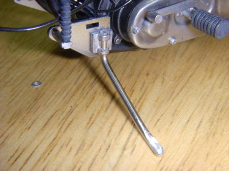 スタンドも金属棒に置換え以前、ハーレーファットボーイを作った時、展示中にディスプレーケースの中でスタンドが折れて倒れてしまっていた。 その時にも補修で同様の金属棒を使用したので、今回も同じように最初から作り替えておいた。 キットのスタンドは、1ミリ程度 シンチュ線は持ってるけど、意外に柔らかいし塗装がめんどくさいので手元にあったラジコンのサーボロッド1.5mmを太すぎかなと思いつつも使用した。 素材が、ステンレスなので非常に固く加工には一苦労だった(汗) (最終更新2010/12/11/Sat/18:07:56)