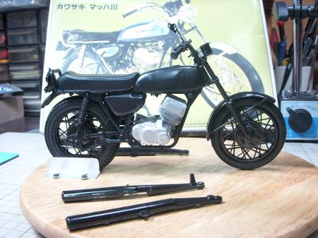 とりあえず、さっと仮組して全体を観察してみる。実車を見た記憶がないので、形やバランスはこのキットで見るのが初めて。 う〜ん、こんな物かな? 写真と比べても、多少の違いはあってもマッハはマッハで、まぁ〜こんなものでしょう まさか、これを別のバイクだという人はいないよね (最終更新2010/12/25/Sat/13:22:55)