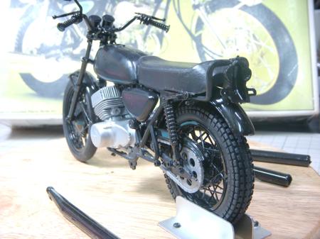バイクはこのバックショットが大好き♪でも、やっぱりマフラーが無いと実感がわかないね。 リアタイヤのゴッツイこと、まるでモトクロスマシン! 資料写真とは全く違うさぁ〜 う〜ん、他のキットからコンバートしようか悩みどころです。 それにしても、さすがに古いキットだけにバリがひどいね。気になる箇所も沢山有るしあれやこれや考えると頭がクラクラしてきました(汗) (最終更新2010/12/25/Sat/19:11:58)