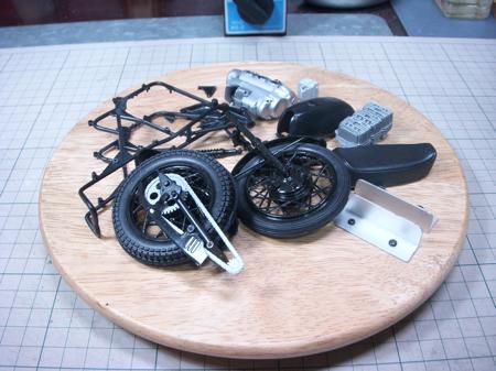 大体、感じもつかめたし修正したい部分もイメージできたので、そろそろ本組み上げに入りたいと思う。仮組の段階で、エンジンプラグ・サイドスタンド・前後ウィンカーのパーツが無いのが判明した。 前後ウィンカーは資料写真にも付いていない状態の実車の写真があったので考証段階でパーツ化されていないようであり、サイドスタンドは省略されているようだ。 エンジンプラグは、欠品かもしくは紛失した可能性が高い 貰い物なので、文句は言えませんね(諦) では、ひとまず仮組した部品をばらします。 (最終更新2010/12/31/Fri/01:19:27)