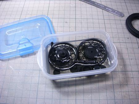 メッキは、キッチンハイターで落とせてもその下地は残ってしまうのでモールドがボテッとしてあまい状態だそのままでは、塗装をはじいてしまうし接着不良等のトラブルを招いてしまう そこで、今度はMrカラーのラッカー系シンナーに付けて表面のニスのような下地を落とす。 しばらくすると、下地が溶け出してシンナーが茶色っぽく濁ってきた。 (最終更新2010/12/31/Fri/01:50:27)