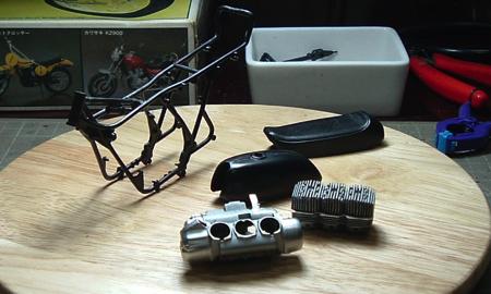 やっぱり、このキットも作りかけ(汗)数年前に、途中で放り投げてしまった放置キットの状態だ(悲) フレーム・エンジン迄は手を付けてあるね。 パーツのメッキもキッチンハイターで全て落としてある状態です。 さぁ〜この状態からの再スタートとなるけど、今度はどうなる事やら・・・ 前回のハーレーの時の勢いが止まないうちに頑張ってみましょう(笑) (最終更新2010/12/25/Sat/13:08:35)