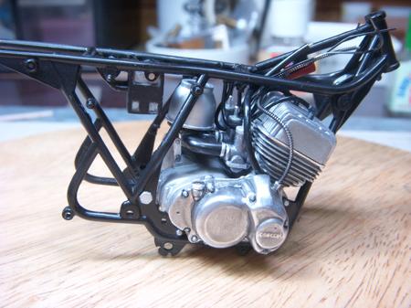 最初にクランクケースを載せて、次にシリンダー部分、そしてエアクリーナーを知恵の輪のように角度を変えながら中に押し込んでやっとフレームにマウントする事が出来た。狭いフレーム内でプラグ類のパイピングを施して無事エンジンのマウントが完了。 本来ならもっと細かなパイピングが有るようだけど省略する この程度でもなんとか雰囲気は出ていると思うが・・・突っ込みは無しね(汗) 後はバッテリー廻りがスカスカな感じがするので、この辺に適当に配線コードを張り巡らせて雰囲気を作る予定。 (最終更新2011/03/07/Mon/13:39:49)