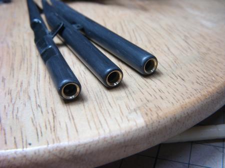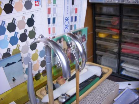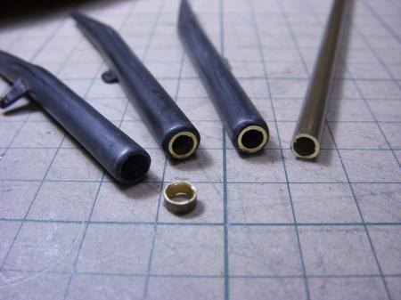 そろそろ、マフラーなどの塗装を始めようかと思ったら・・・マフラーのパイプエンドが気になった 分割された合いの悪いマフラーを無理やり張り合わせて修正してあるのでパイプエンドが真円になっていないのは当たり前の結果だよね。 そこで、手持ちで径の近いパイプをあてがって真円を表現することにした。 5ミリのシンチュウパイプを輪切りにして中に押し込む。 (最終更新2011/03/10/Thu/11:16:13)