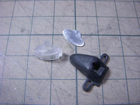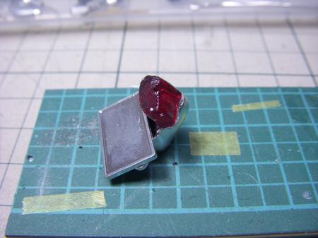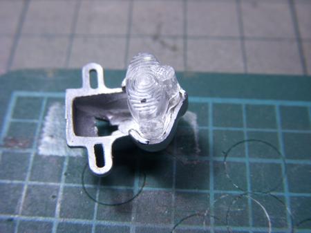実車の参考写真でレンズの取付けビスがキラッと光って見えていたので、見てしまったのはやっぱり気になってしまいついでに虫ピンでビスの表現もしてみた。ベースへの接着は瞬間接着剤を使用するためこの虫ピンを利用して裏側から接着、 レンズ部分に直接、瞬着を流すことが無く曇りの心配が無くなったので、むしろ虫ピンの工作はディティールアップと併せて一石二鳥で良かったと思う。 でも、後ろのアルミ板がまだ大きく出っ張っているようなのでなるべくレンズとツラ一になるように削り込む必要有りだね(汗) (最終更新2011/03/23/Wed/14:18:58)