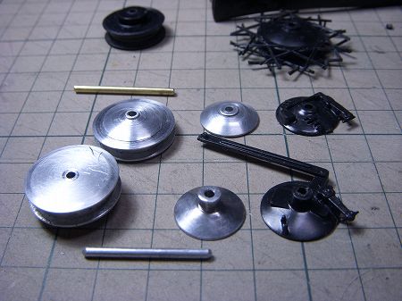 ジュラルミンを削ってフロント&リヤのハブが一応完成!若干形が違うようだけど・・・ まぁ〜、こんなもんでいいでしょう(笑) (最終更新2011/02/09/Wed/13:40:43)