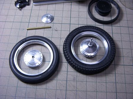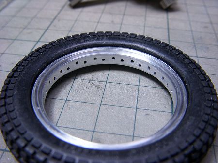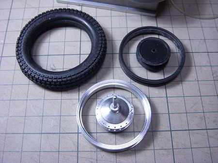 削り上がったフロント&リアのリムに実際にタイヤをはめてみたやっぱり本物の金属は実感が沸きますねぇ〜♪ 塗装もいらないので楽チンだぁ〜 でも、ひかり過ぎの感じがあるので逆に汚し塗装が必要かもね さあ〜今度は、穴あけとスポーク張りのチマチマ作業が残ってるサァ〜! 気が遠くなりそう〜〜www (最終更新2011/02/10/Thu/11:58:36)