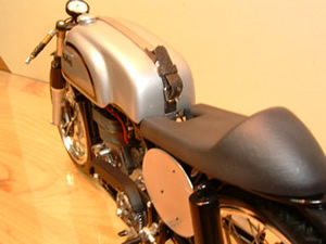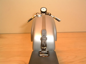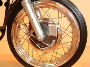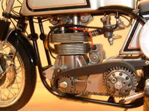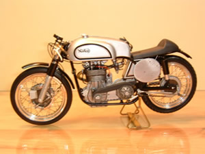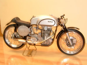 Norton MANX DOHC (ノートンマンクス DOHC) ■プロター 1/9 SCALE プロター製のバイクモデルは、ビニ本のように透明包装されているため箱を開けて中を確認する事が出来ません。買うのには勇気がいり、値段も張るので尚更、決断が必要ですが、家に帰って箱を開けると必ずと言っていいほどビックリさせられます。このNORTONもご多分に漏れずせんべいのようなバリがビッシリ着いた、まるで食玩のお化けのような物でした。意を決して作り始めましたが、大部分のパーツを 金属素材で作り替える羽目になりました。 |