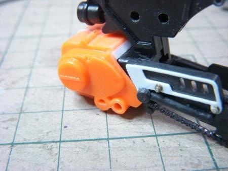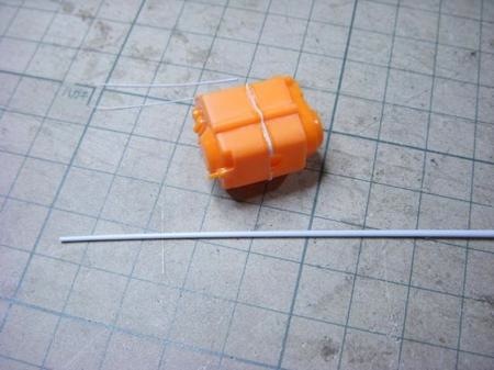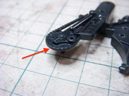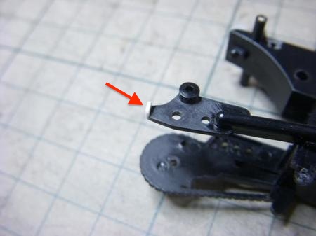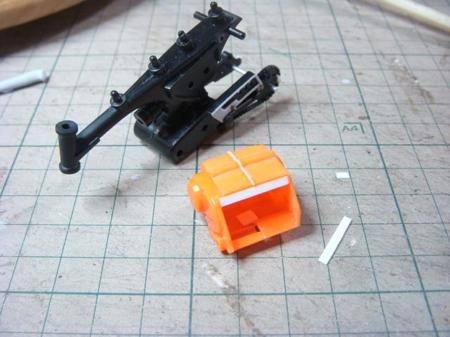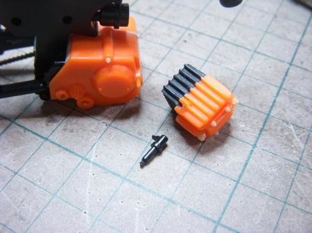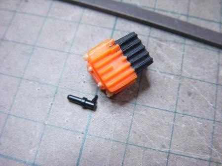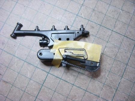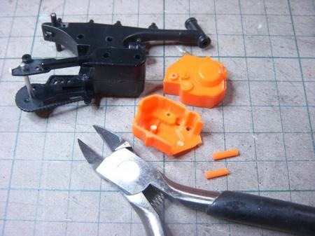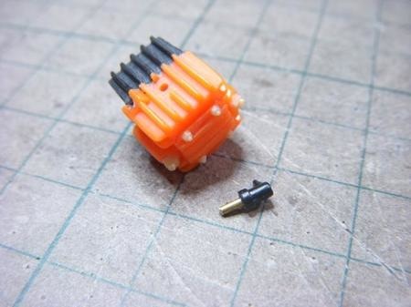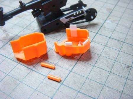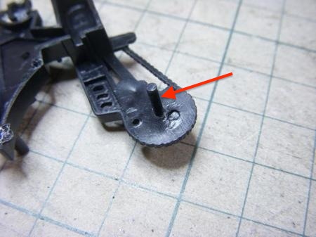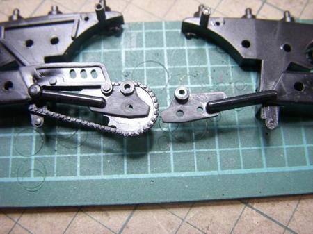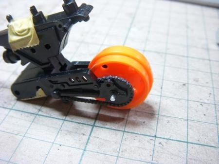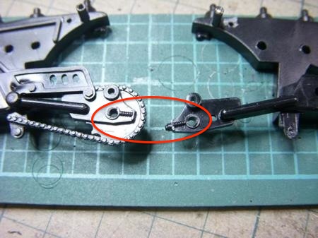 ヤスリを駆使してチェーンの凹凸モールドが出来たので 次にタイヤ取付のシャフトピンをカットして あとからでもタイヤが取付けられるように加工しておきます。 |