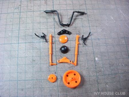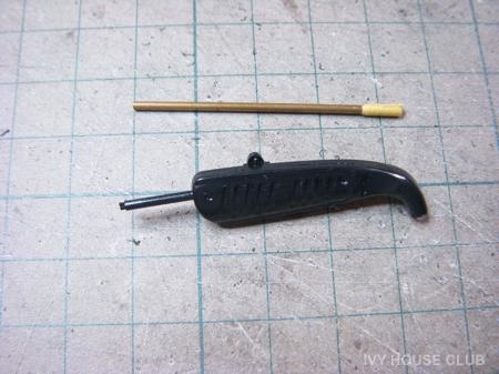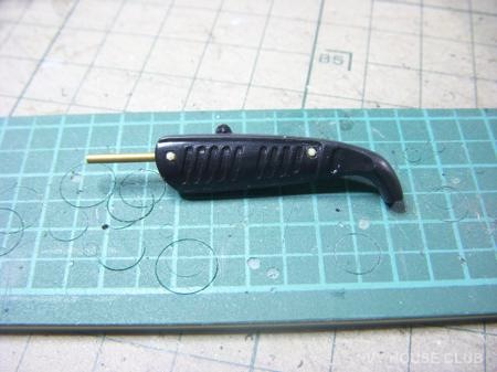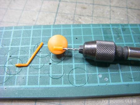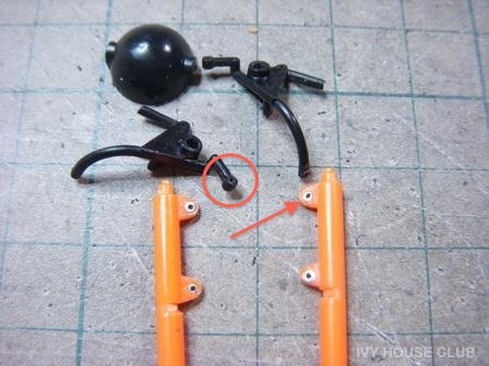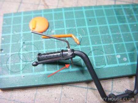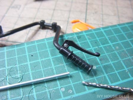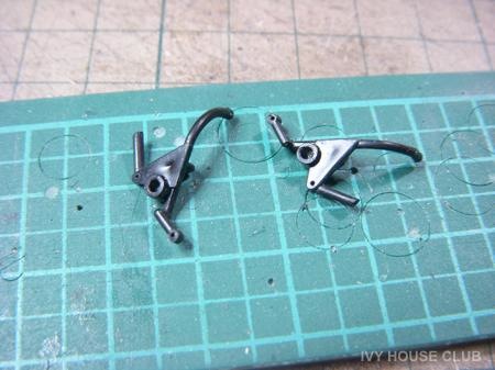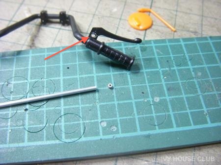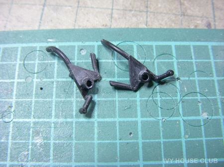 ヘッドライト周りの部品は なので ステーのダボを削り取って後に虫ピンが差し込めるように0.5ミリの穴を開口した。 フォーク側のブラケットはアルミパイプを差し込んで |